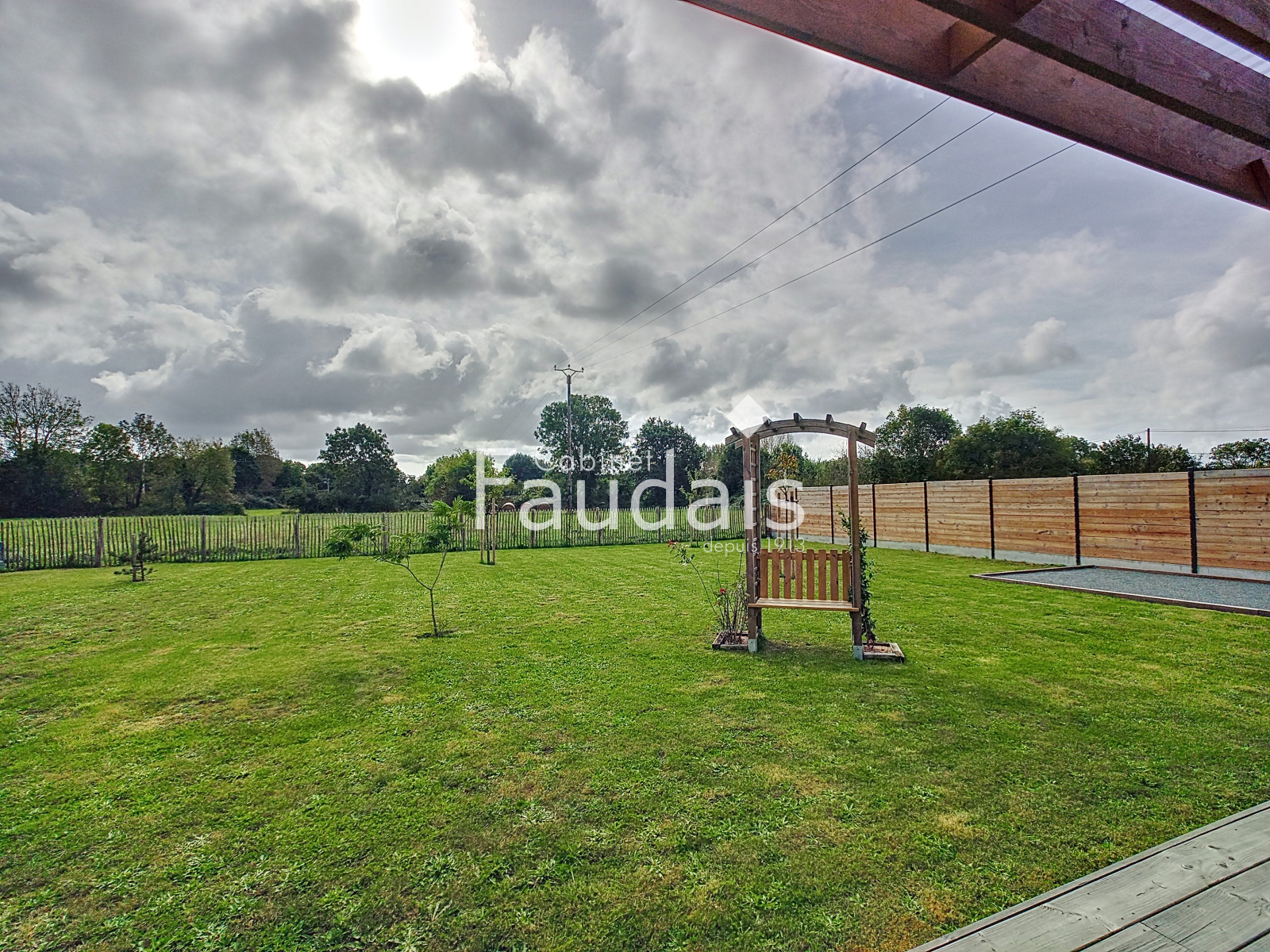 Installez vous plein sud sur la terrasse bois avec pergola pour profiter du terrain clos de 733 m² avec vue degagée.