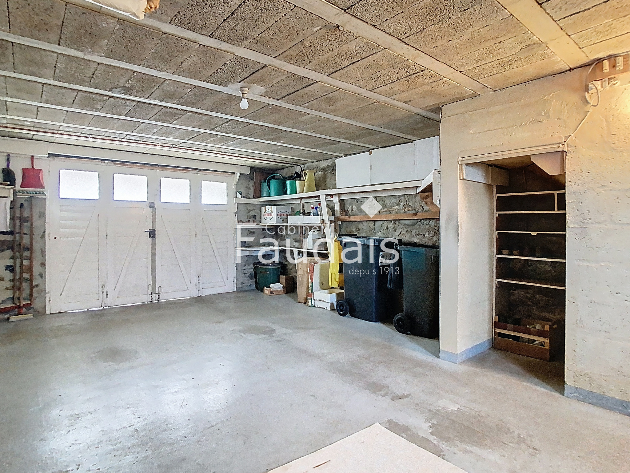 Sous-sol complet avec espaces garage, stockage, chaufferie.