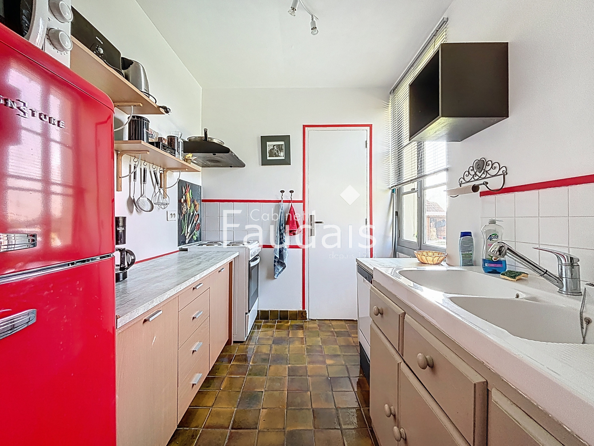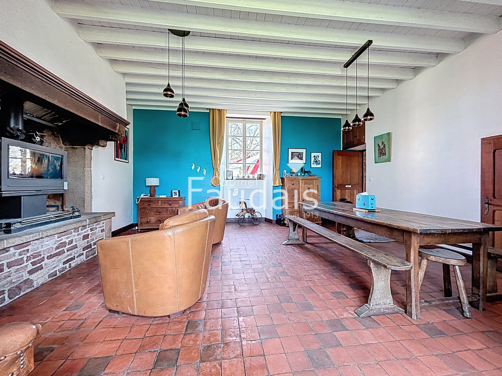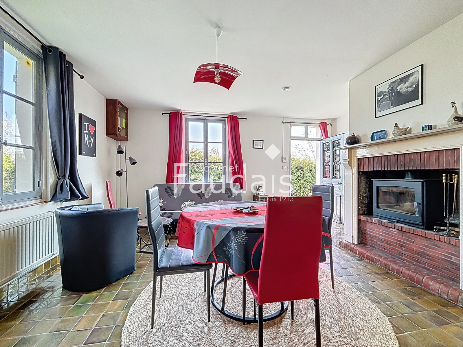 Rez-de-chaussée : entrée, salle à manger chaleureuse avec insert bois, cuisine aménagée, buanderie et WC