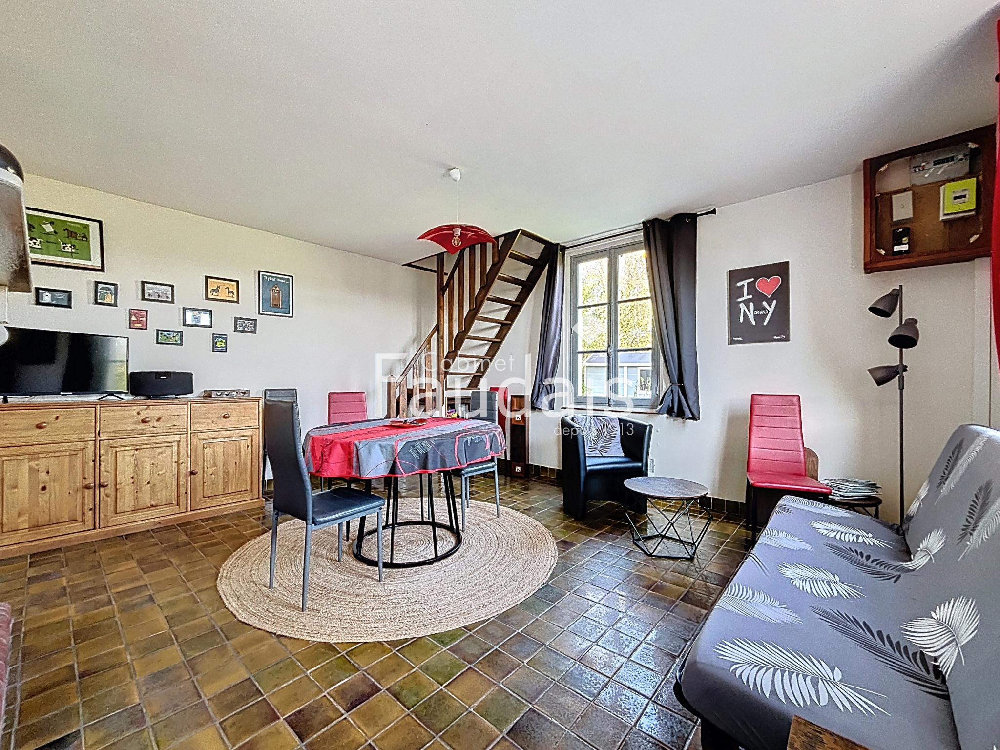 1er étage : salon cosy avec poêle à granulés, une chambre, salle de bains avec WC