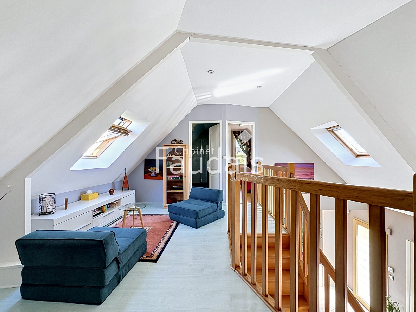 A l'étage, une grande mezzanine dessert trois chambres mansardées et une salle d'eau avec wc.