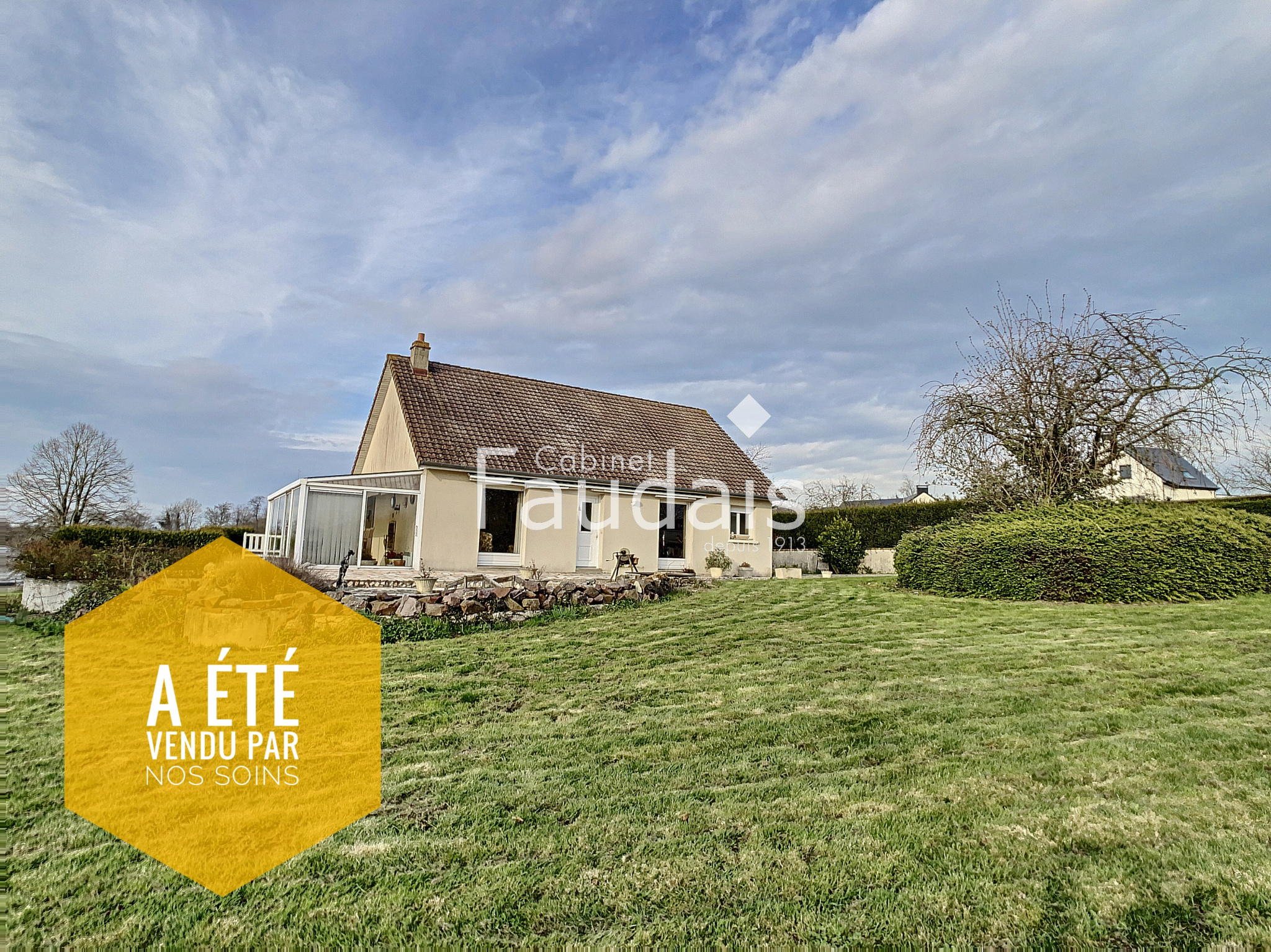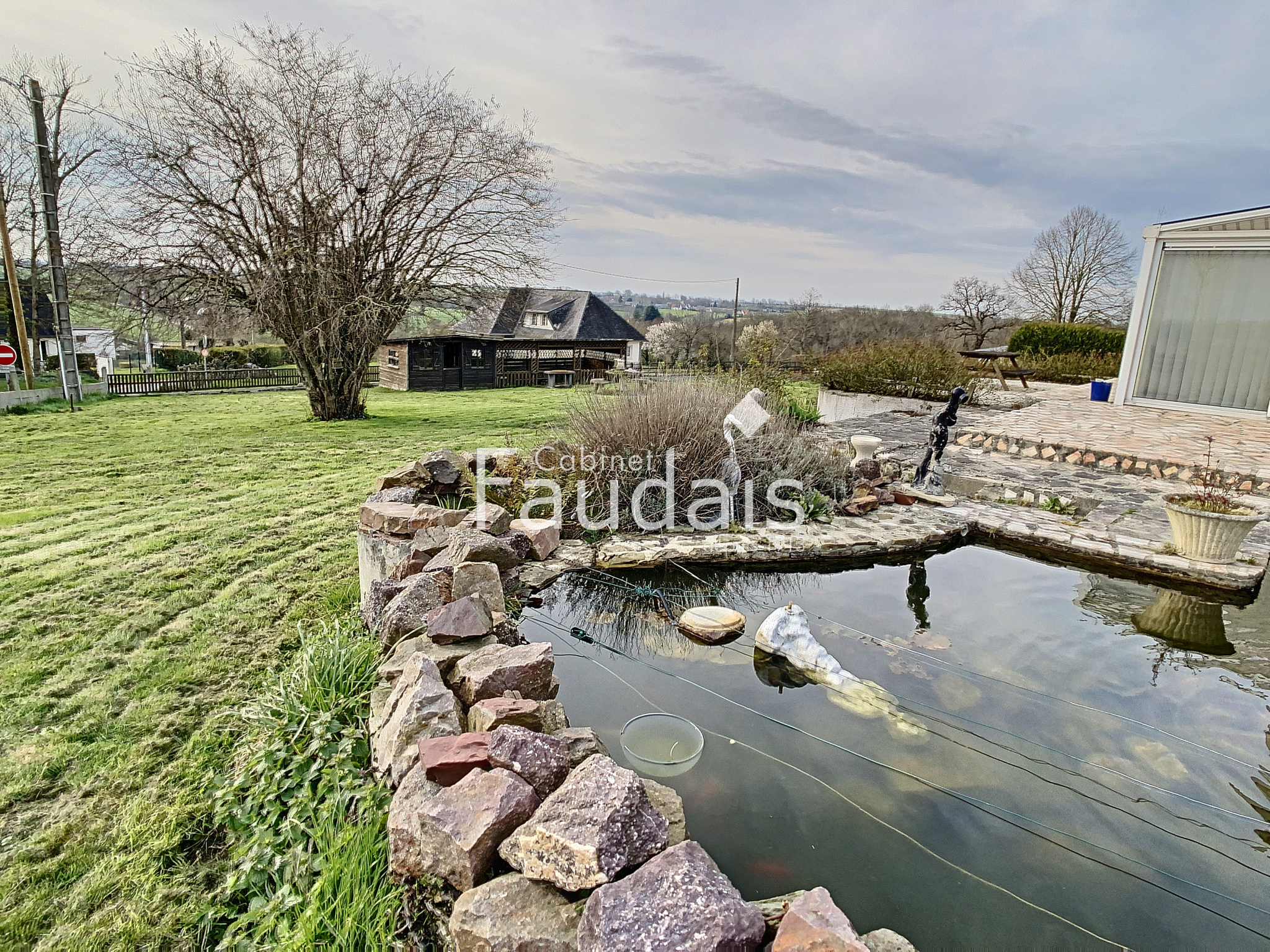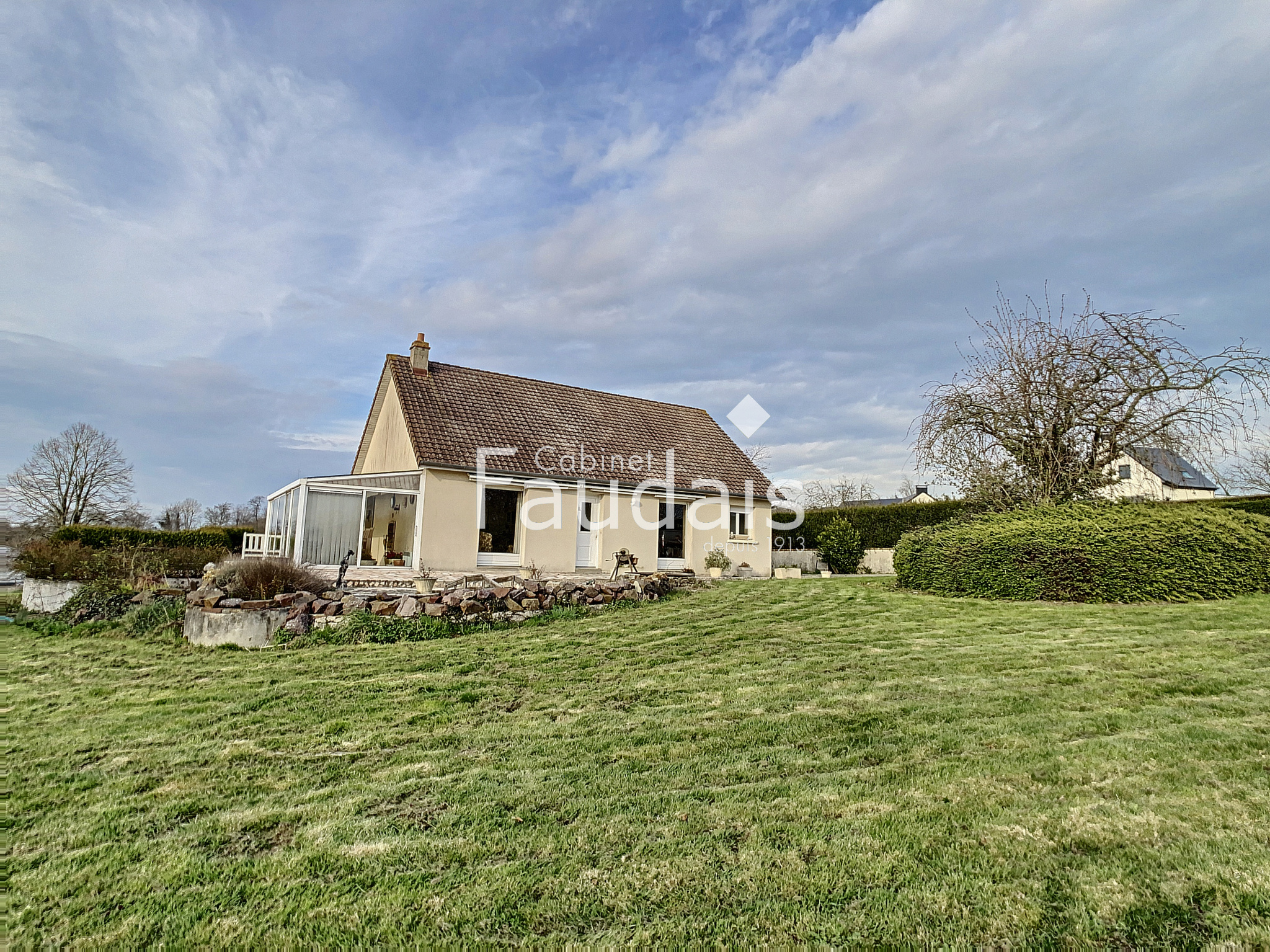 Villers-Bocage (14310)C'EST VENDU !! SUR LA COMMUNE DE VILLERS BOCAGE ! Le CABINET FAUDAIS vous présente ce pavillon d 'exception de par sa situation géograpihique , sa tranquillité grâce à son grand terrain et sa vue ! Il est de PLAIN PIED et de construction de qualité. Il se compose d'une entrée donnant sur le séjour/salon avec cheminée- insert double foyer, d'une cuisine séparée aménagée et équipée, d'une véranda de 23 m² chauffée et de 2 chambres et salle de bains avec douche, wc. Un sous sol de plus de 130 m² ainsi qu'une dépendance de 33 m² complètent ce bien. Le terrain agrémenté d'un bassin et d'une dépendance en bois est de 4700 m² : il est sans vis à vis, avec une vue d'exception. Il n'est pas constructible pour le moment ...à voir à l'avenir mais rien n'est garanti. Pour plus de renseignements, contactez Valérie COLLIN au 06.24.71.15.40.