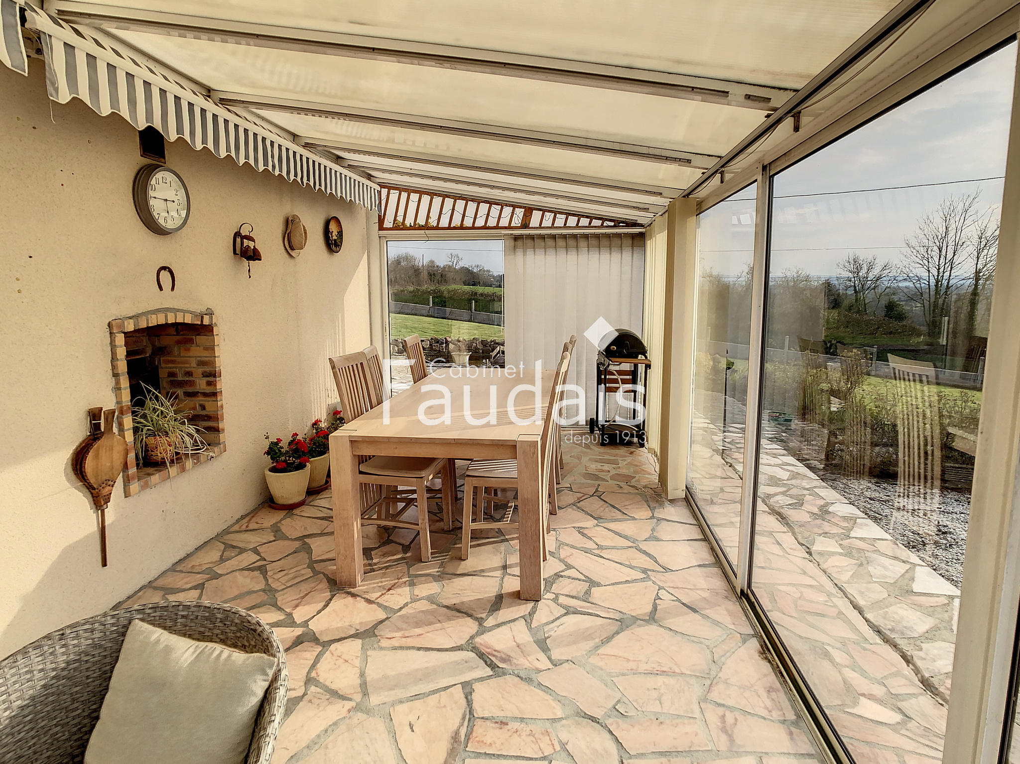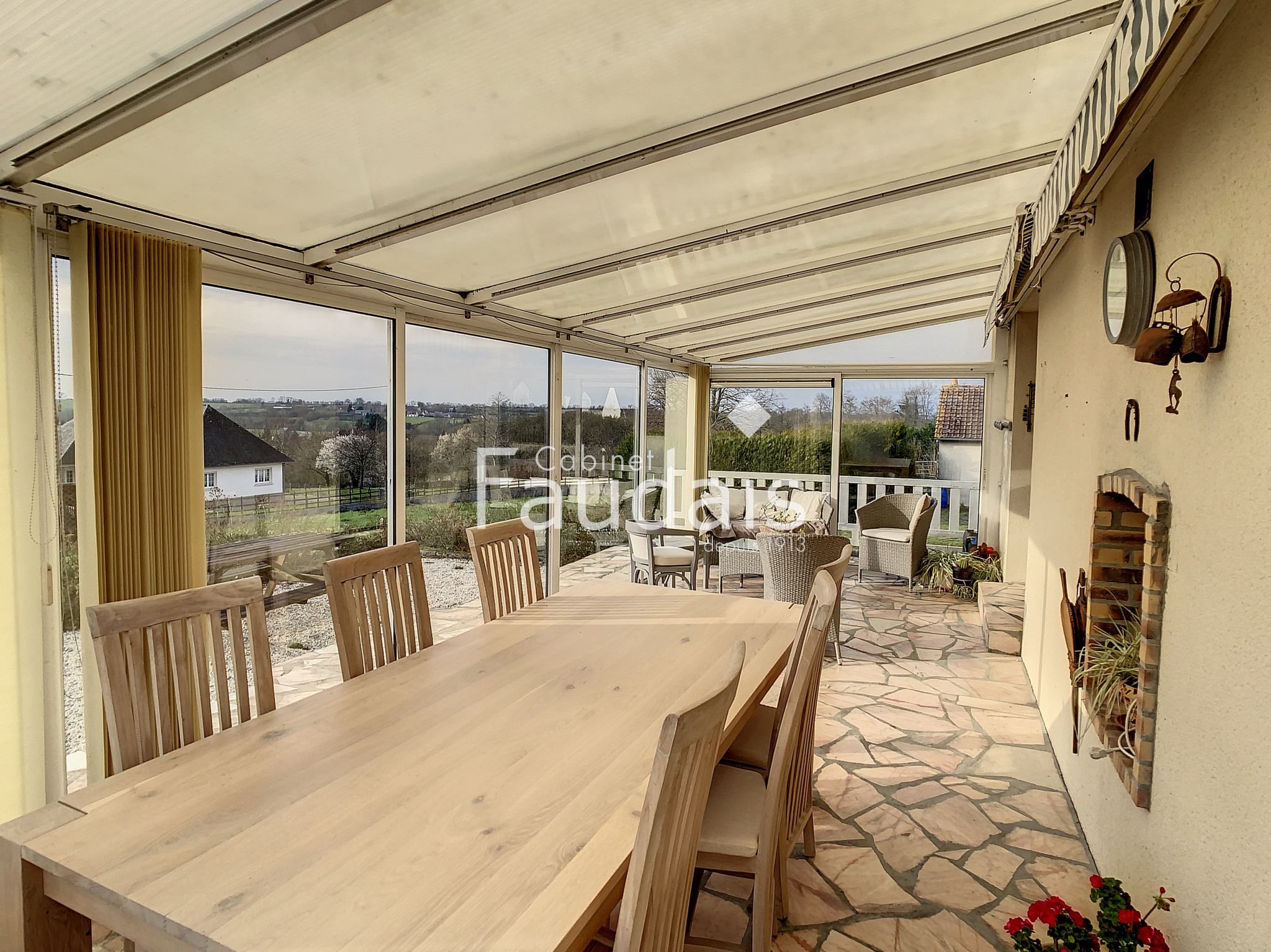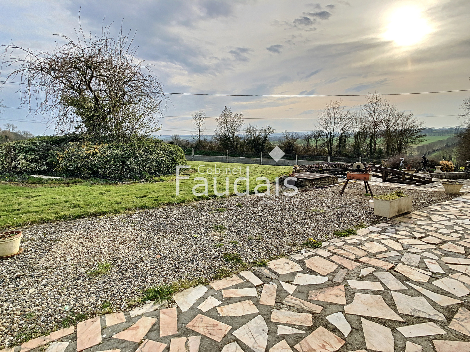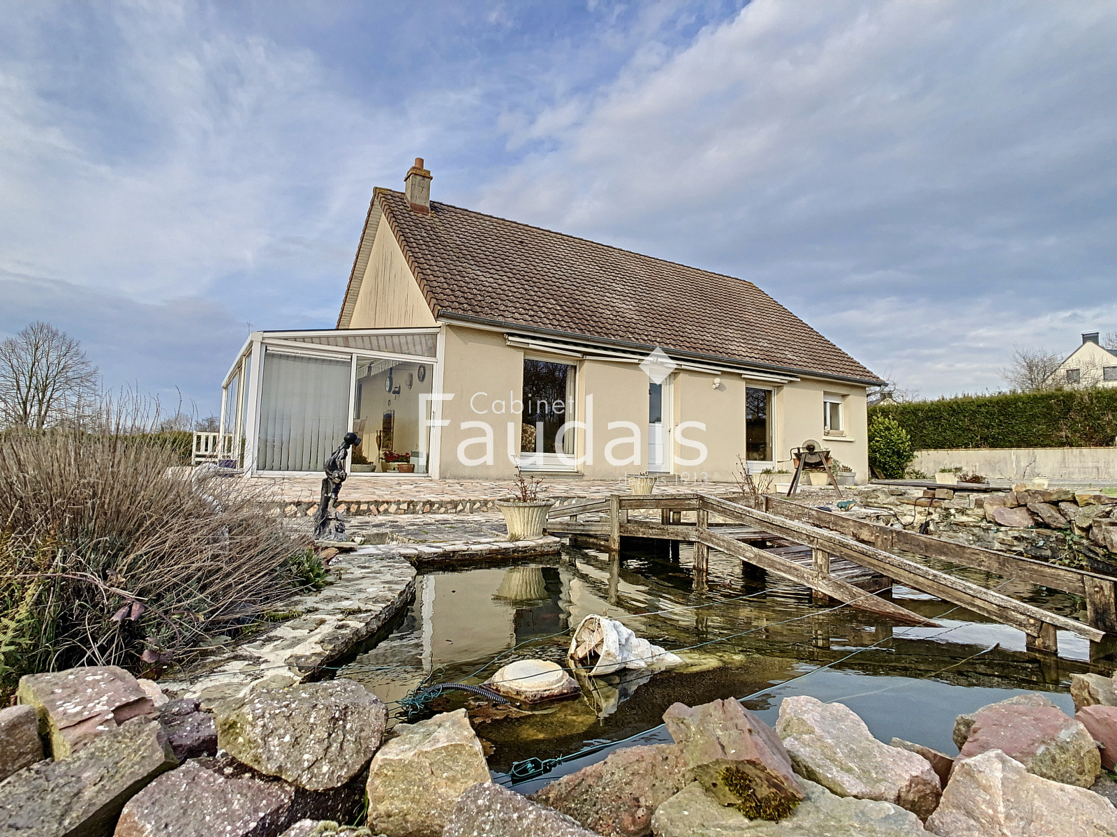 Villers-Bocage (14310)C'EST VENDU !! SUR LA COMMUNE DE VILLERS BOCAGE ! Le CABINET FAUDAIS vous présente ce pavillon d 'exception de par sa situation géograpihique , sa tranquillité grâce à son grand terrain et sa vue ! Il est de PLAIN PIED et de construction de qualité. Il se compose d'une entrée donnant sur le séjour/salon avec cheminée- insert double foyer, d'une cuisine séparée aménagée et équipée, d'une véranda de 23 m² chauffée et de 2 chambres et salle de bains avec douche, wc. Un sous sol de plus de 130 m² ainsi qu'une dépendance de 33 m² complètent ce bien. Le terrain agrémenté d'un bassin et d'une dépendance en bois est de 4700 m² : il est sans vis à vis, avec une vue d'exception. Il n'est pas constructible pour le moment ...à voir à l'avenir mais rien n'est garanti. Pour plus de renseignements, contactez Valérie COLLIN au 06.24.71.15.40.