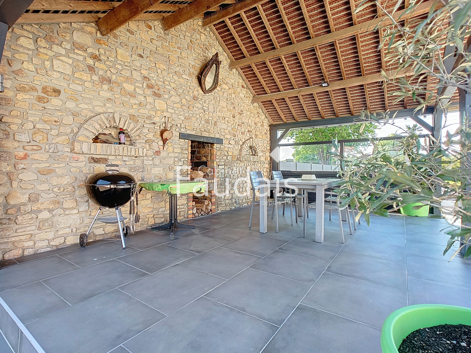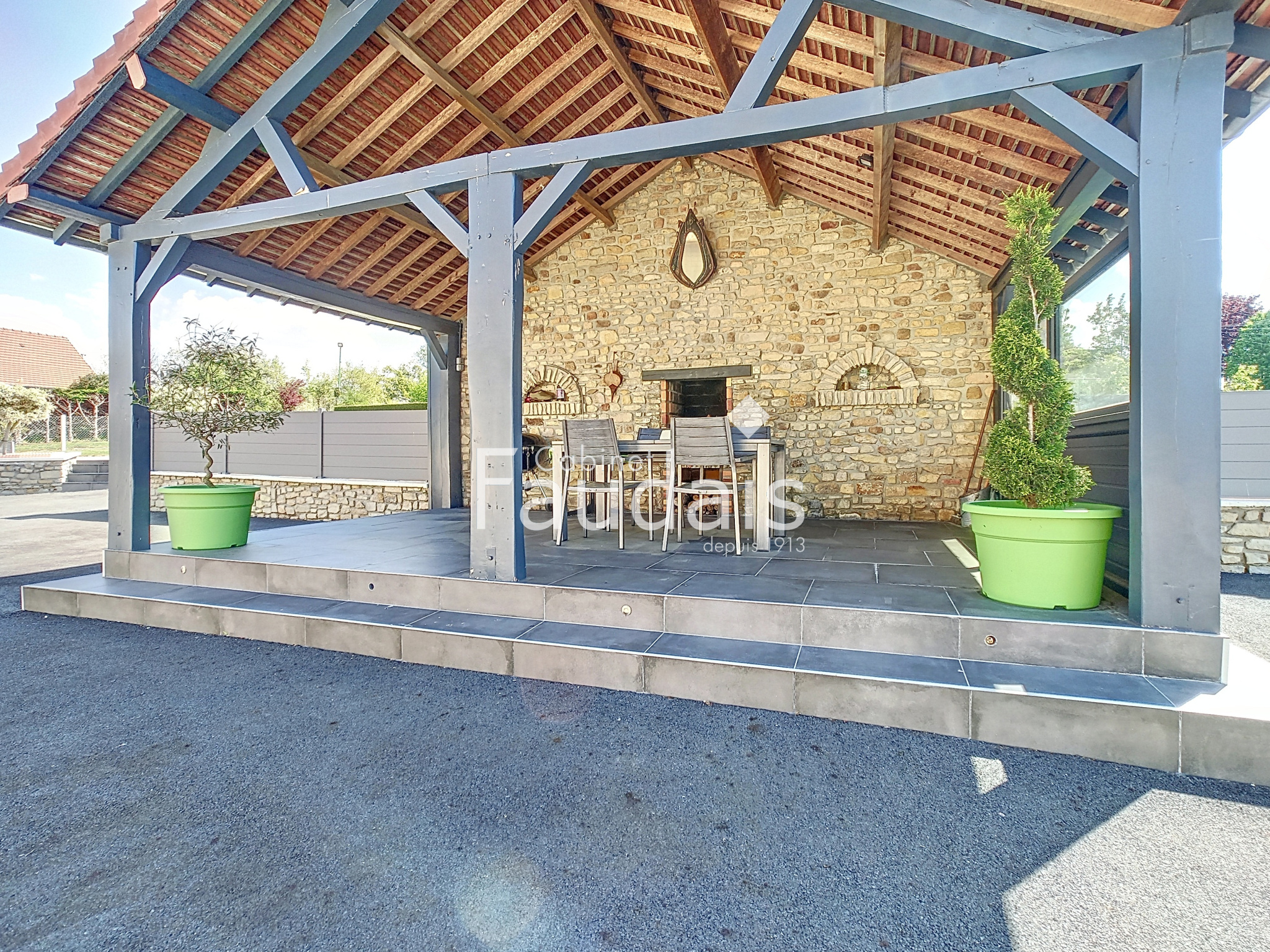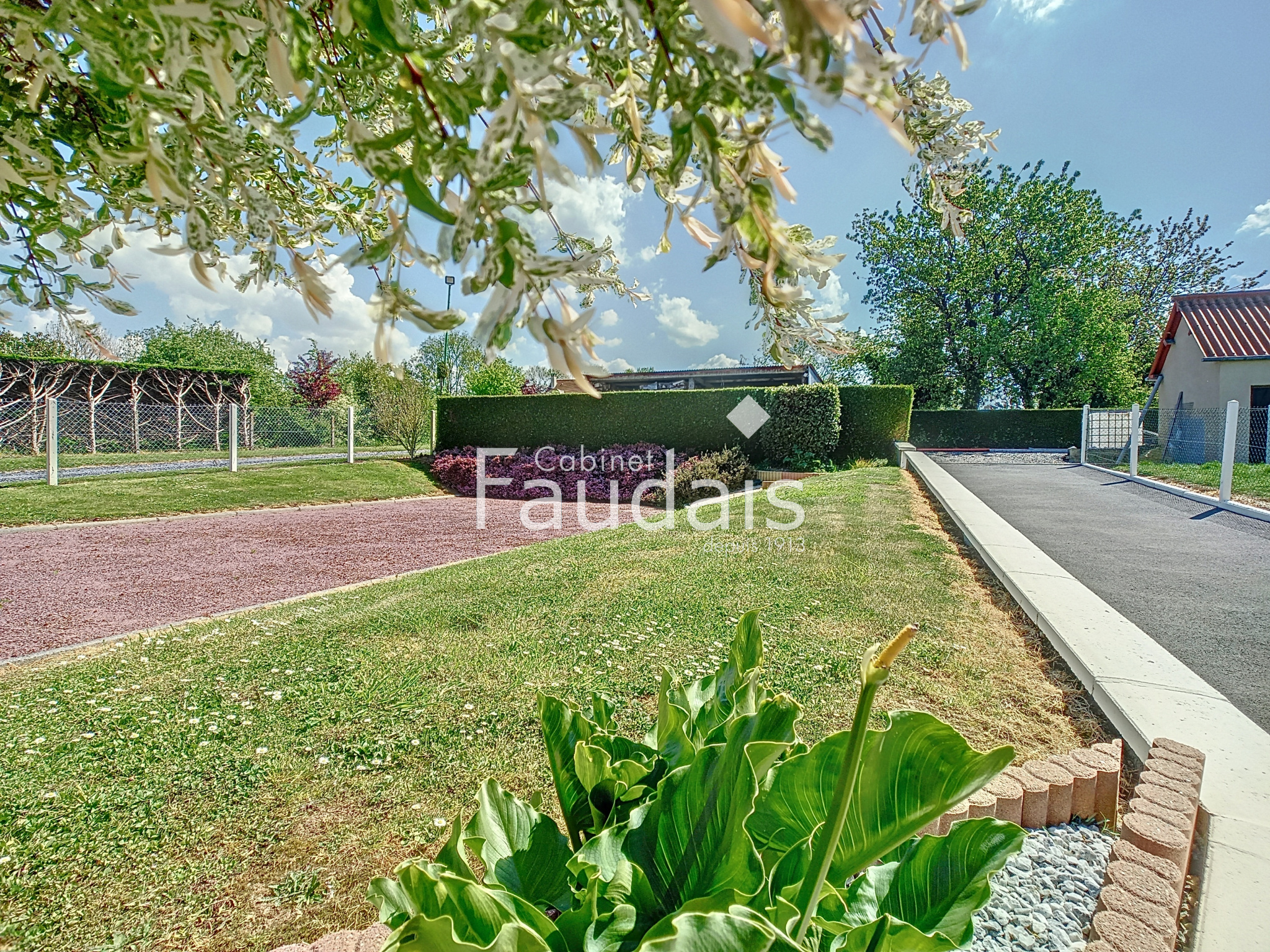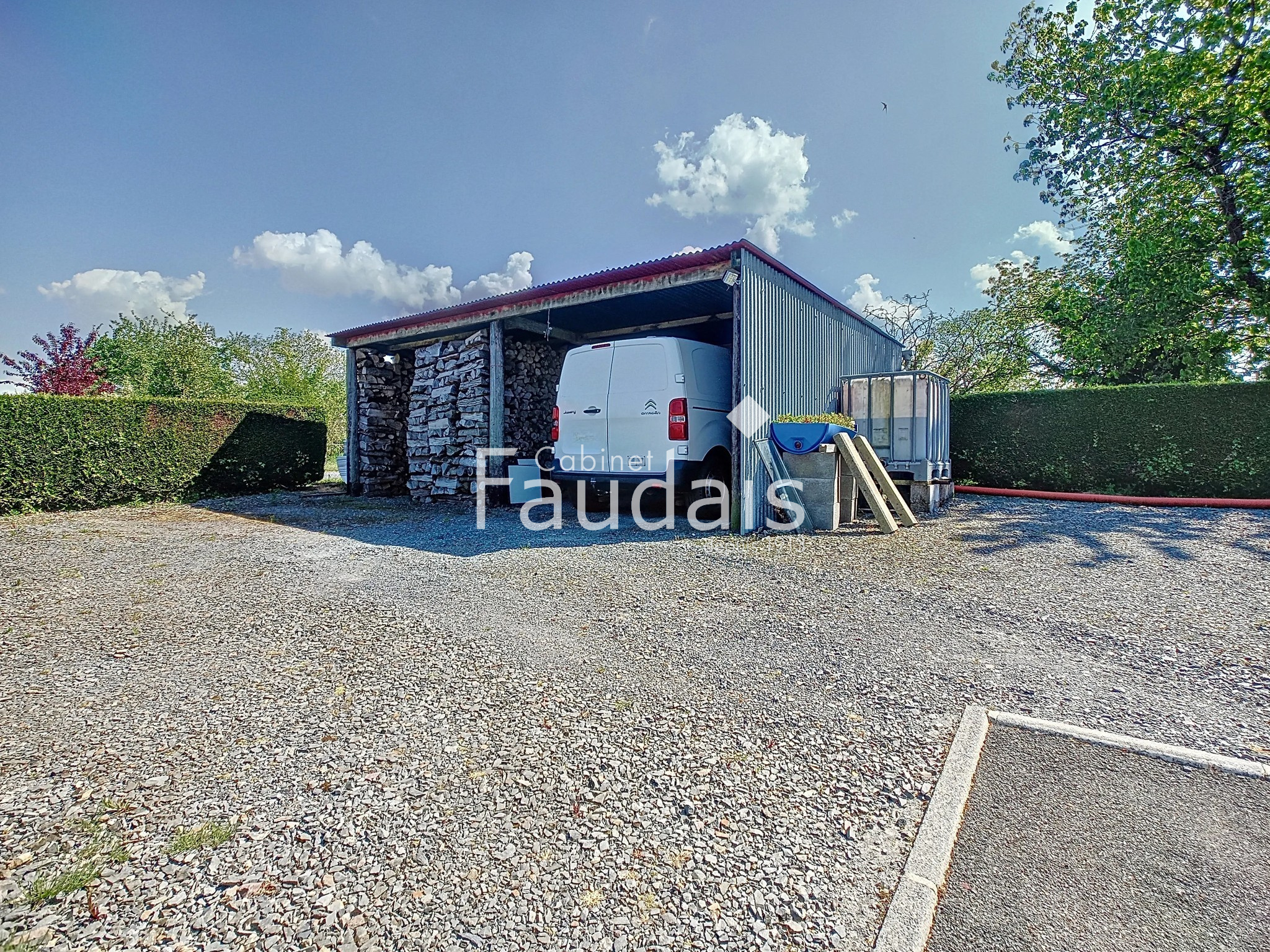 A cela s'ajoute une terrasse couverte avec barbecue, un abris bois pouvant également accueillir un véhicule, un terrain de pétanque, un cabanon de jardin et une dépendance servant de poulailler.