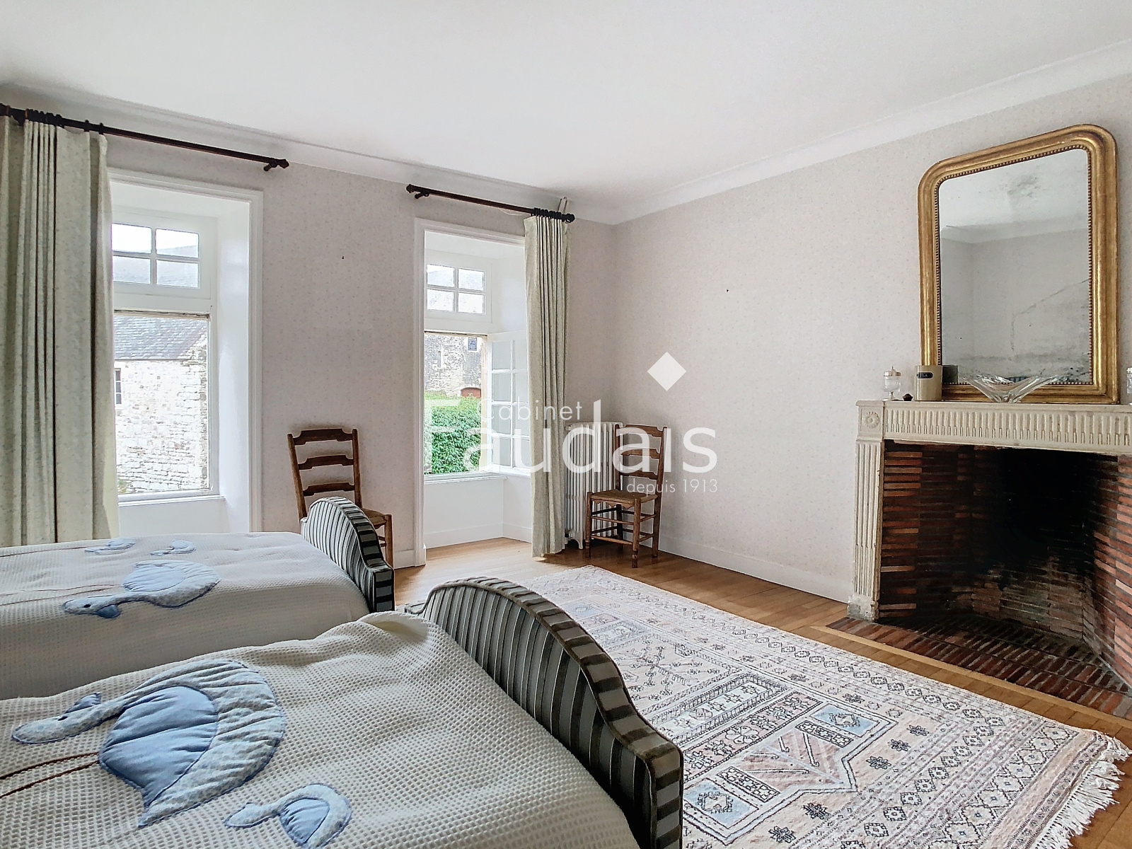 Au 1er étage: long corridor sur façade arrière desservant une chambre (~19m²) avec salle-de-bains et wc privatifs (~4,30m²) puis 5 autres chambres (~24 - 21 - 17 - 14 - 11m²) et salle de bains et wc;