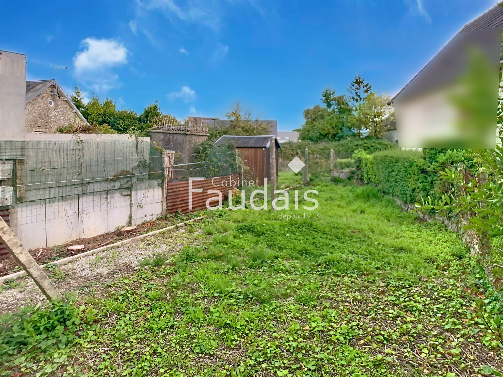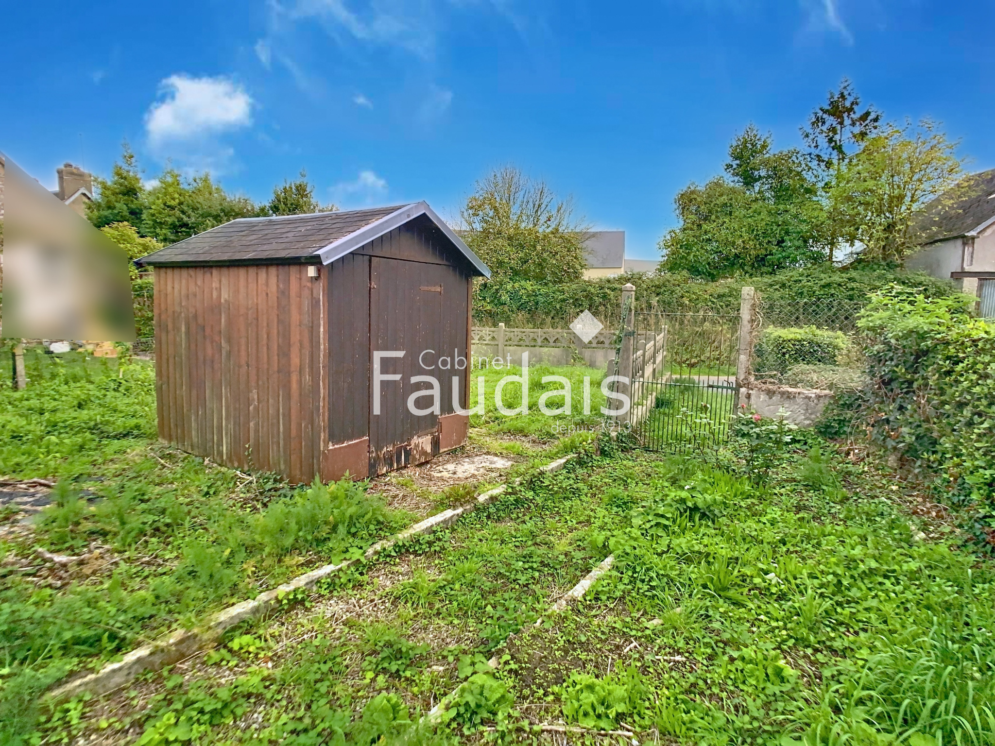 Terrain à l'arrière de la maison pour une contenance de 307 m² avec abris de jardin et terrasse.