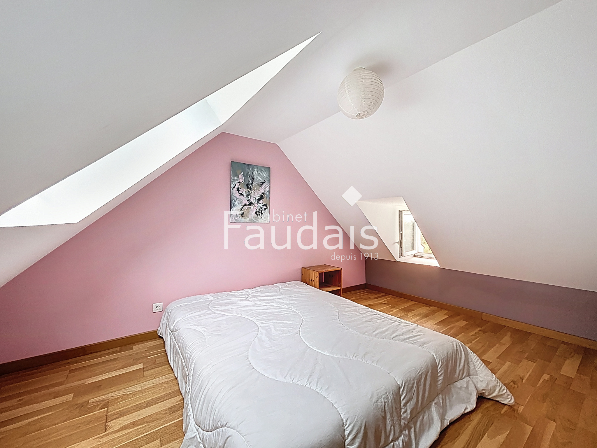 À l’étage, un palier en mezzanine dessert un bureau ainsi que trois chambres. Deux salles de bain avec WC viennent compléter ce niveau, idéal pour accueillir famille et invités.