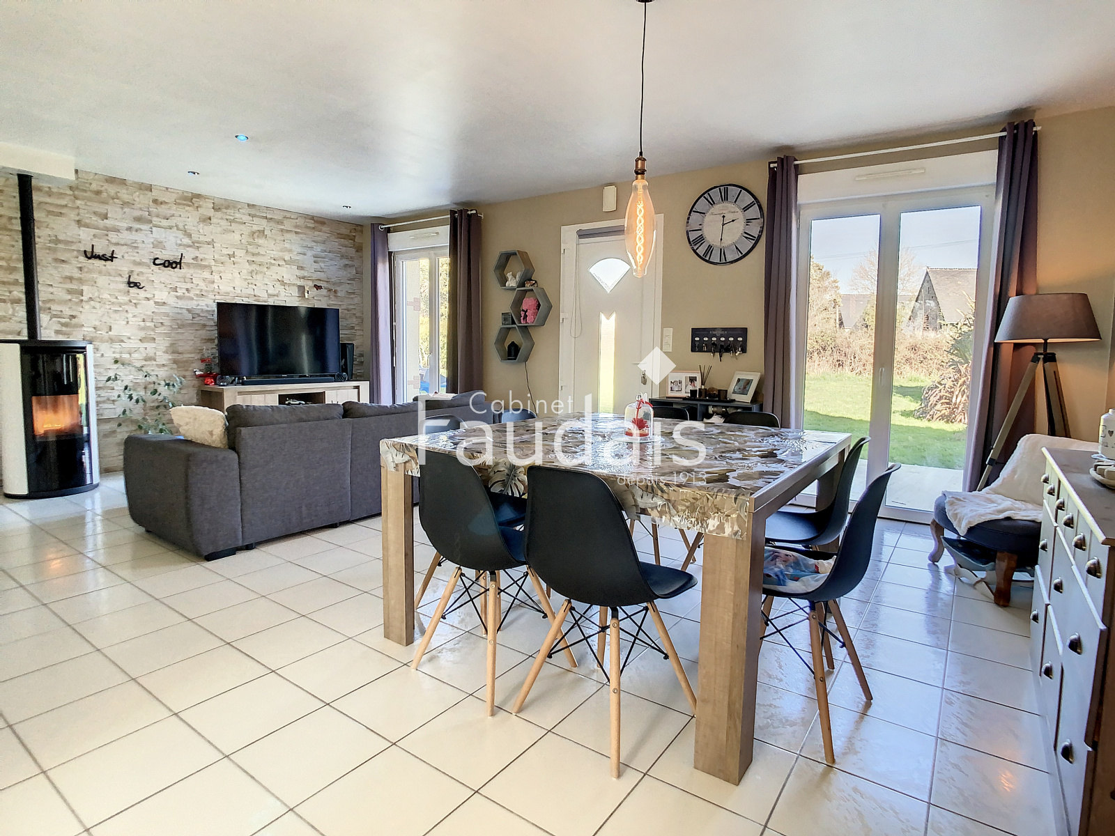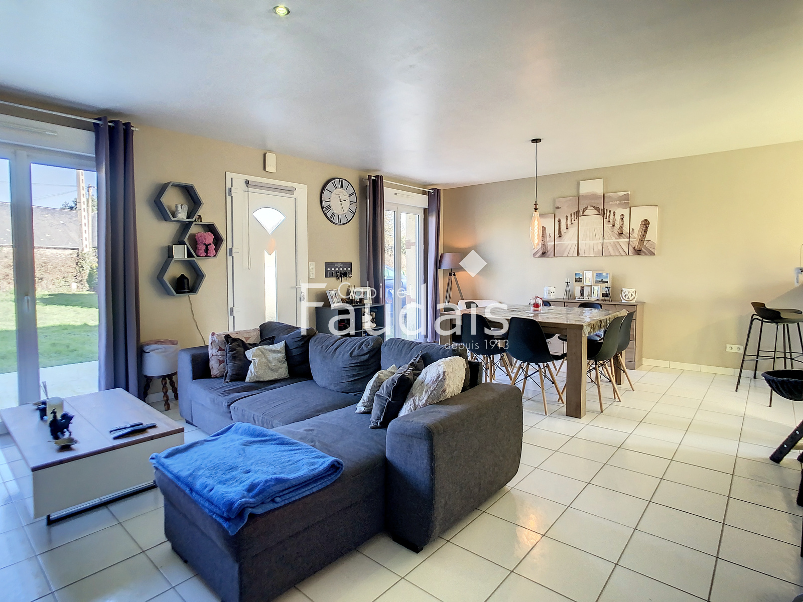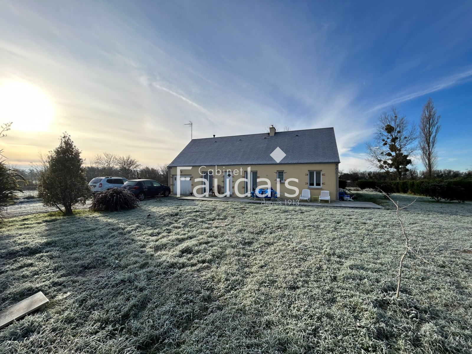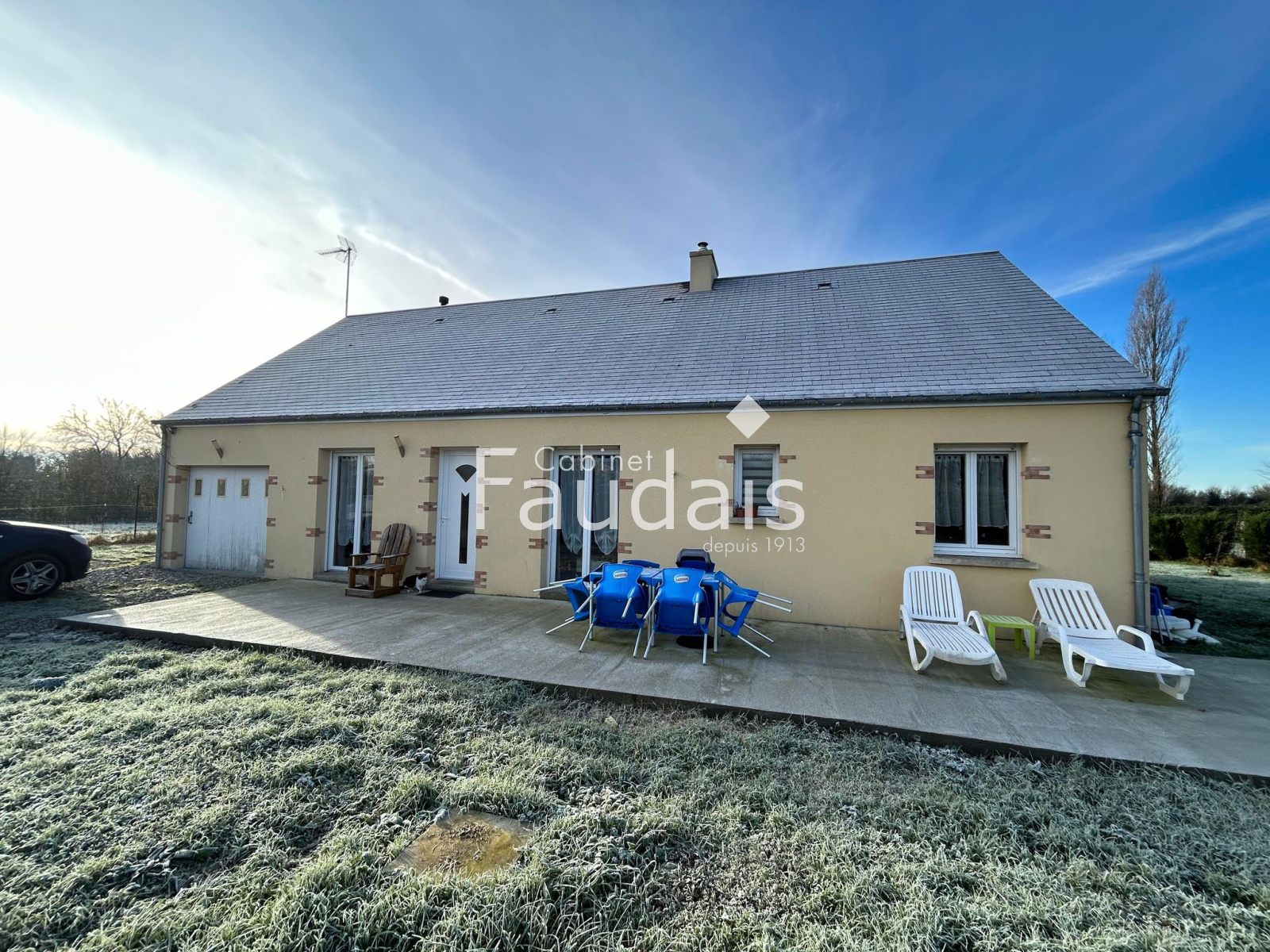 Denneville (50580)Au calme, dans un hameau, le CABINET FAUDAIS vous présente un pavillon de plain pied sans aucun travaux offrant une cuisine équipée ouverte sur séjour/salon avec poêle à granulé, un dégagement desservant 4 chambres, une salle d'eau avec placard et wc. Garage sur le côté et 2 abris de jardin. Terrasse et terrain clos de 1200m².