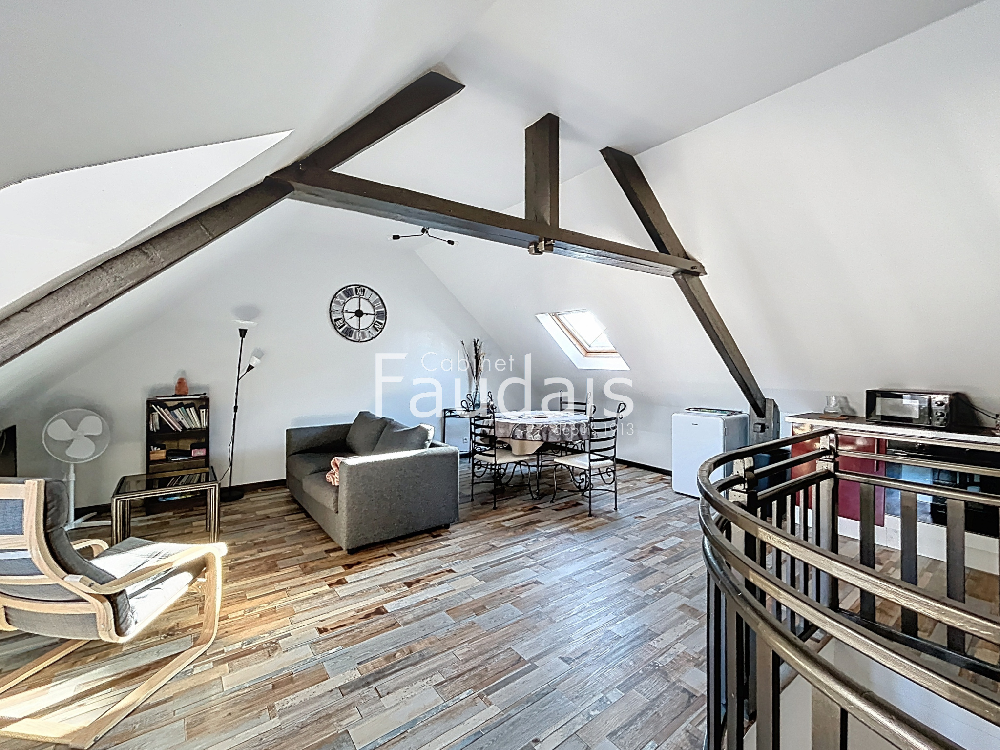 LOGEMENT 3 : Au dernier étage, une pièce de vie cosy avec un coin cuisine, une chambre et une salle d’eau avec WC. Idéal pour un couple ou une personne seule, ce dernier niveau offre une belle vue sur Grandcamp et une belle luminosité.