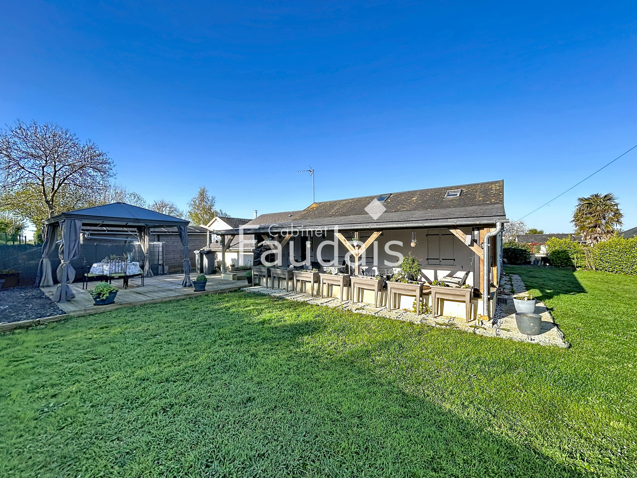 Grandcamp-Maisy (14450)A 5 mn à pied de la mer et des commerces de Grandcamp maisy, LE CABINET FAUDAIS vous présente une maison de plein pied composée d'un séjour ouvert sur une cuisine récente (2024) entierement aménagée et équipée, deux chambres, une salle d'eau et une toilette. A l'étage une mezzanine et une pièce mansardée. Un garage avec porte automatique est accolé à la maison. Côté exterieur une grande terrasse semi couverte suivie d'un kiosque. Une remise en bois complete ce bien. Le terrain de 529m² est completement clos et arboré.