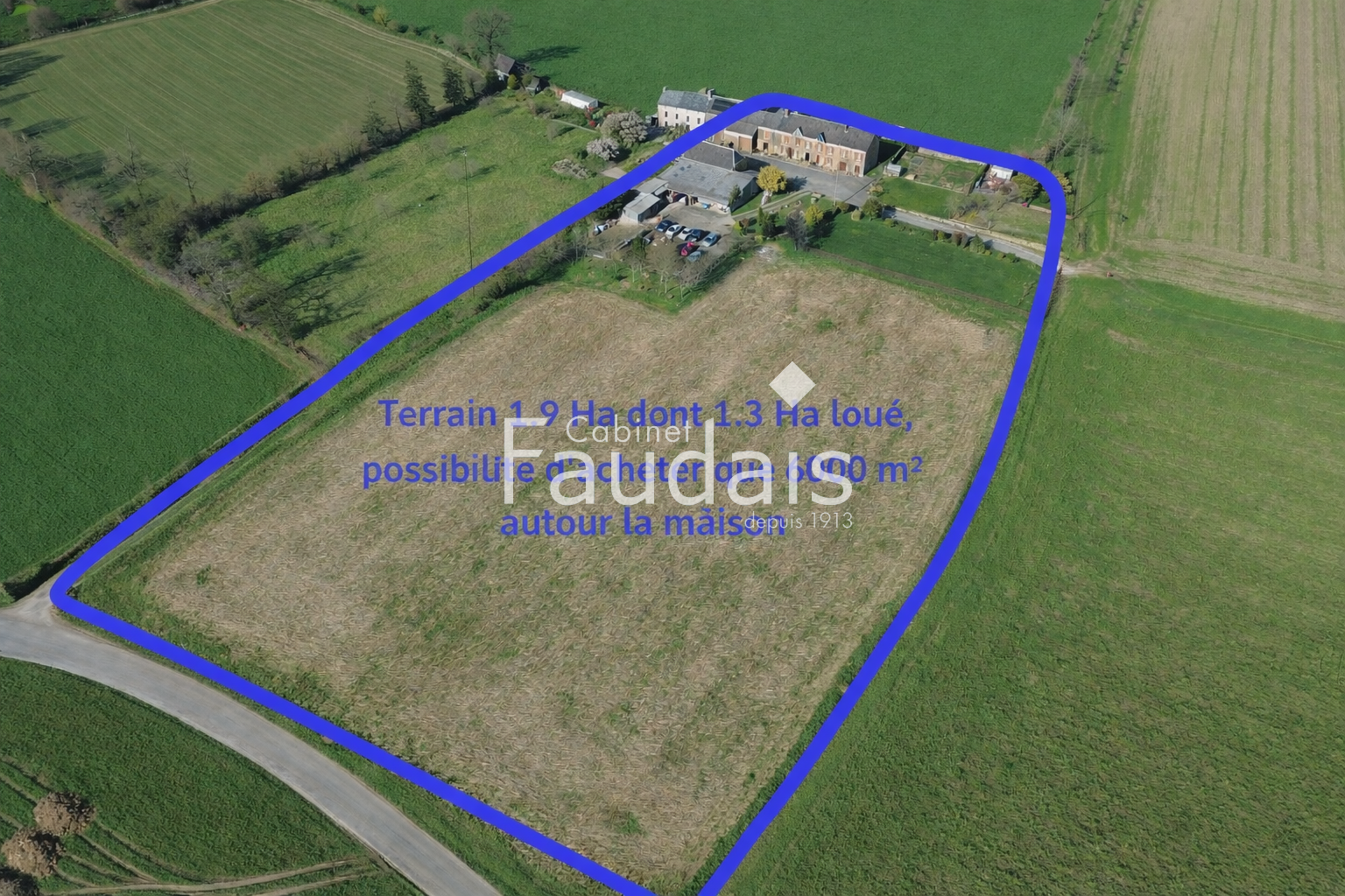 La propriété s’étend sur environ 1,9 hectare de terrain, dont 1,3 hectare actuellement loué, offrant à la fois de l’espace, de la tranquillité et un environnement rural préservé particulièrement apprécié.Il est également possible d'acquérir le bien avec simplement 6000m² autour de la propriété.