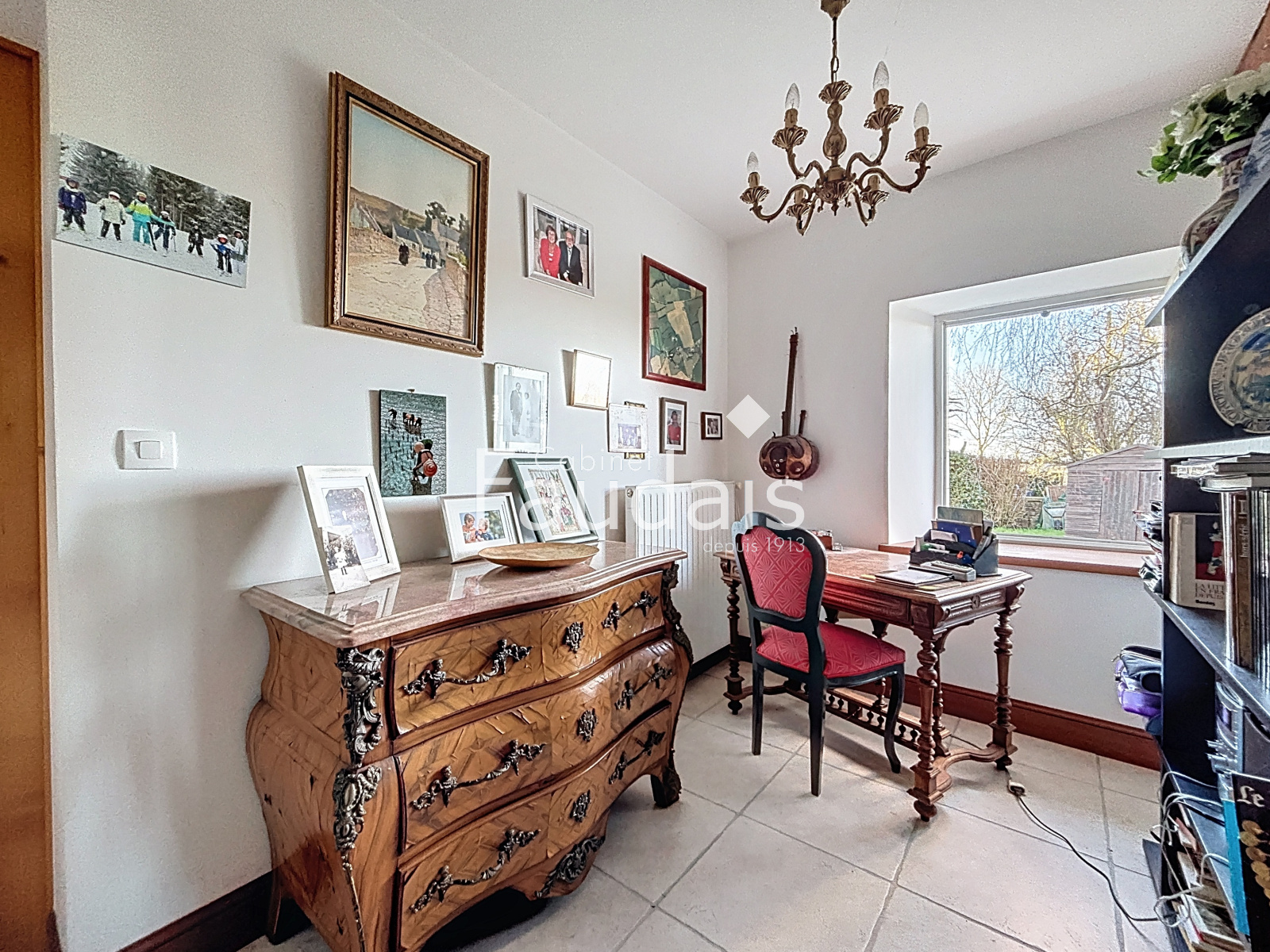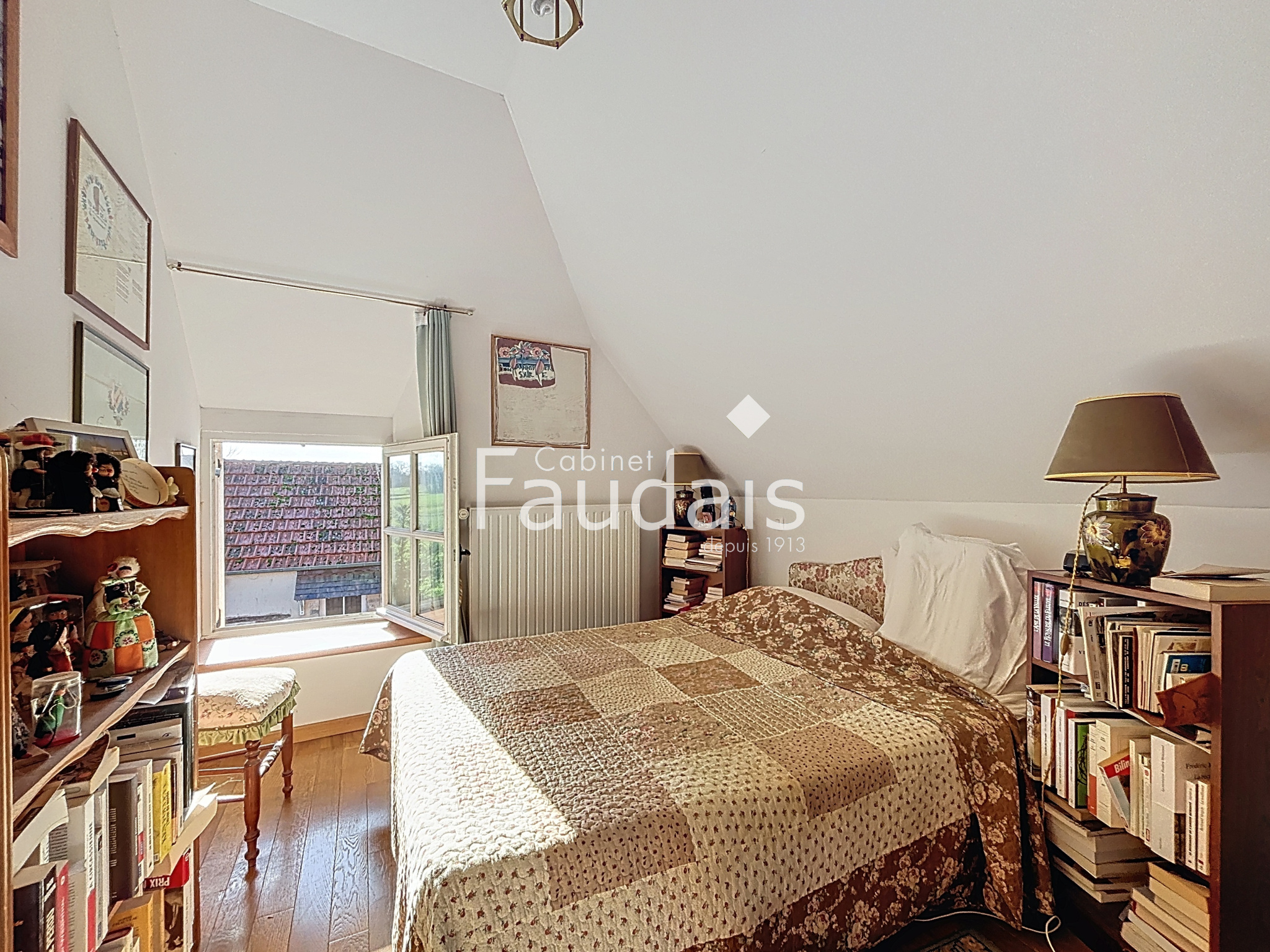 Elle offre une entrée, une buanderie avec douche et WC, une salle à manger pleine de caractère avec cheminée d’époque et tomettes au sol, une cuisine aménagée, une chambre, une salle de bains et un WC indépendant.À l’étage, un palier dessert quatre chambres, chacune bénéficiant d’une vue dégagée sur la campagne et l’ancienne chapelle, ainsi qu’une salle d’eau avec WC.