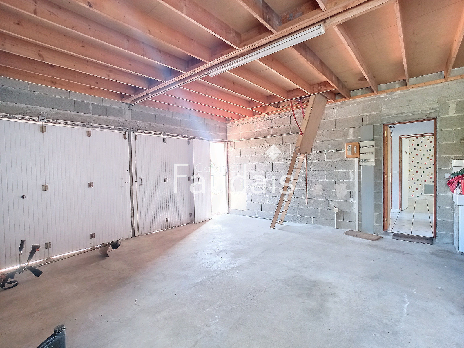 Deux chambres , un bureau, une cuisine aménagée, un salon séjour avec cheminée foyer ouvert, une salle de bains, un WC, un double garage avec cave.Grenier.