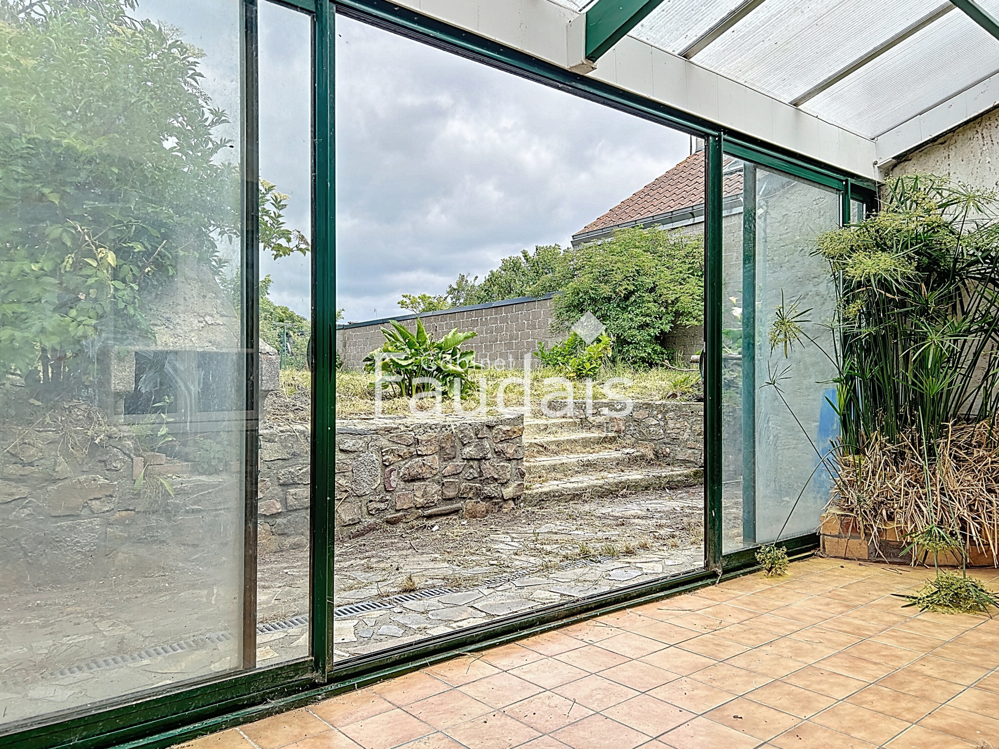 Le garage attenant à la maison permet un accès direct à la terrasse arrière, avec la véranda et un puits, créant une ambiance agréable et fonctionnelle.