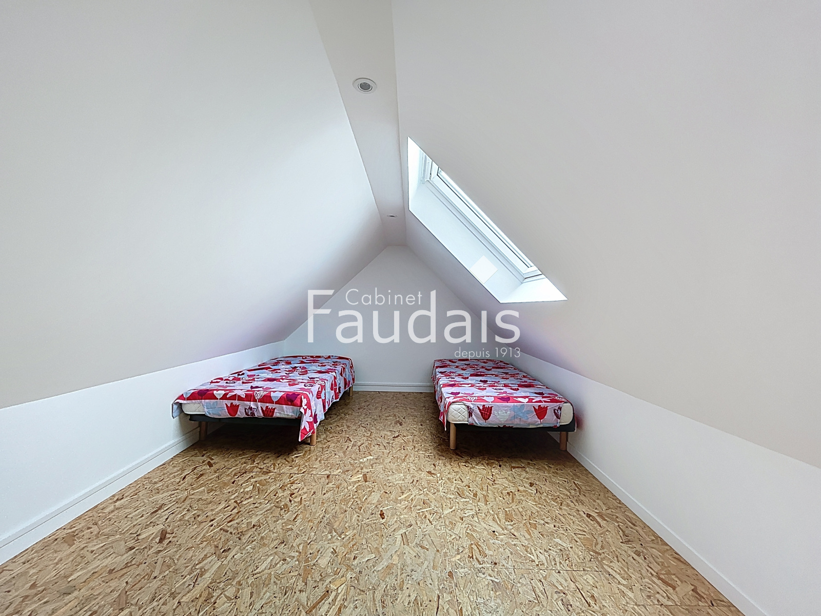 À l’étage, deux chambres mansardées offrent chacune une vue sur la mer.