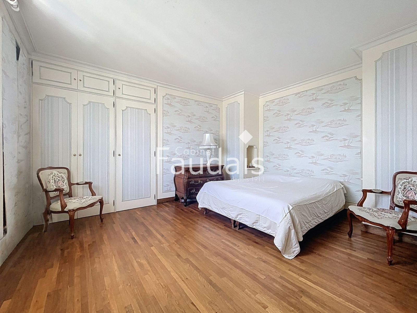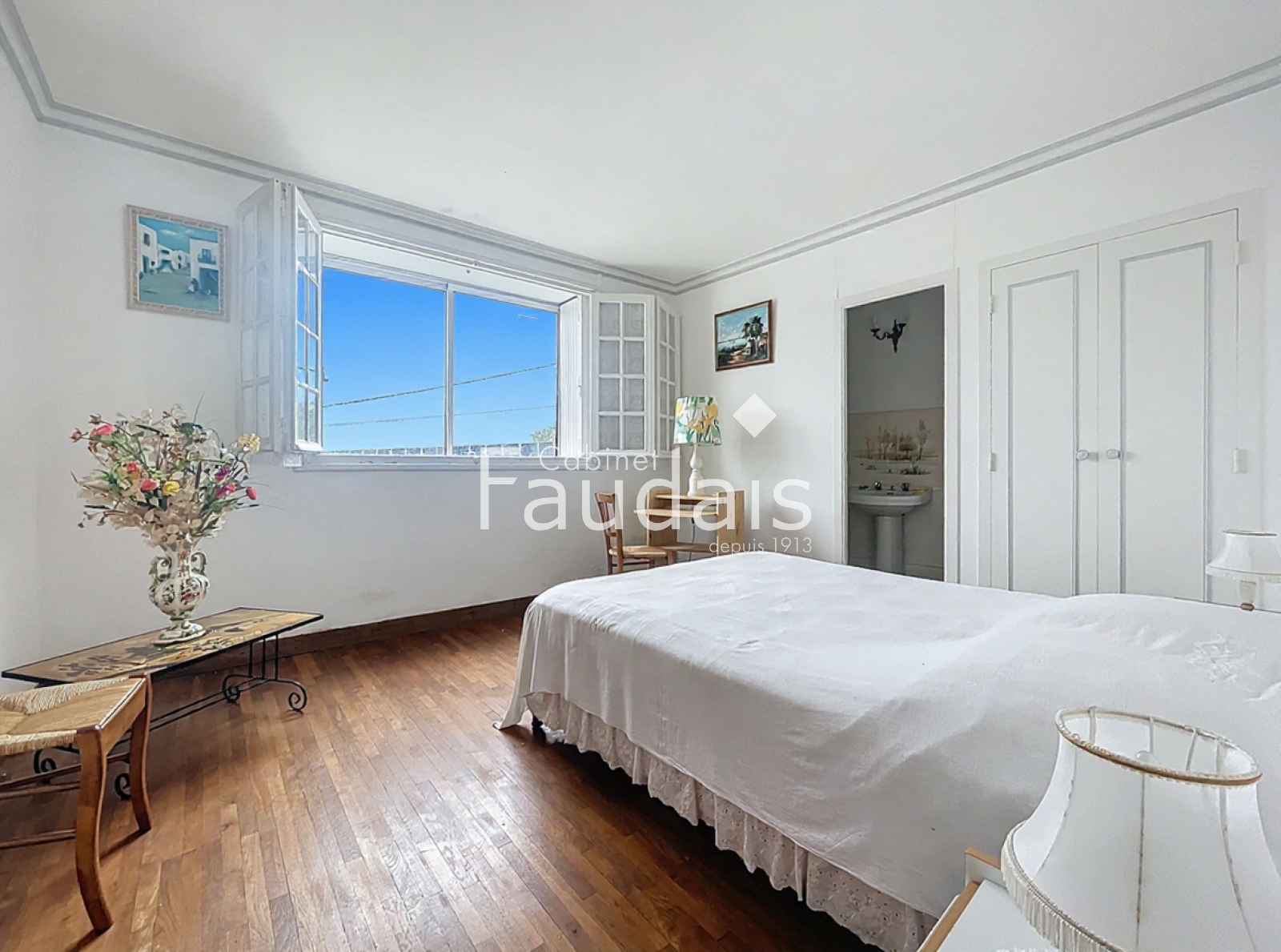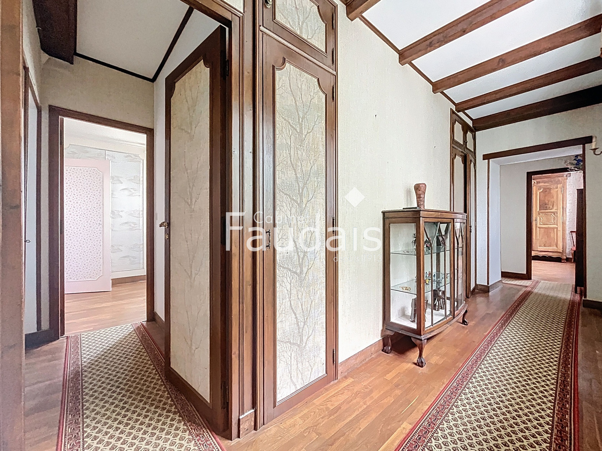 Au premier étage, un couloir dessert une grande chambre avec salle de bains attenante, une seconde dotée d’un coin d’eau, ainsi qu’une troisième chambre.