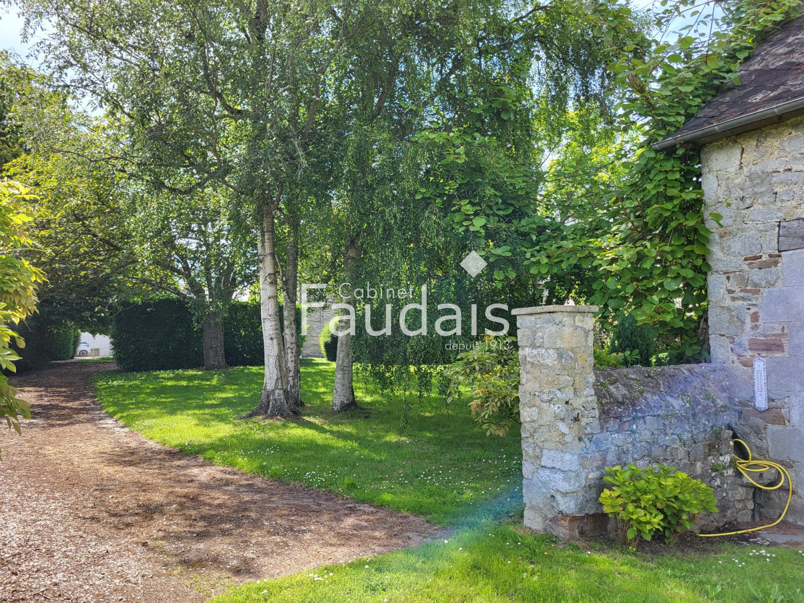 À l’extérieur, profitez d’un jardin anglais arboré avec allée de retournement, parfait pour vos moments de détente. Deux autres jardins paysagers ainsi qu’une grange complètent cet ensemble, comprenant atelier, cave et remise.
